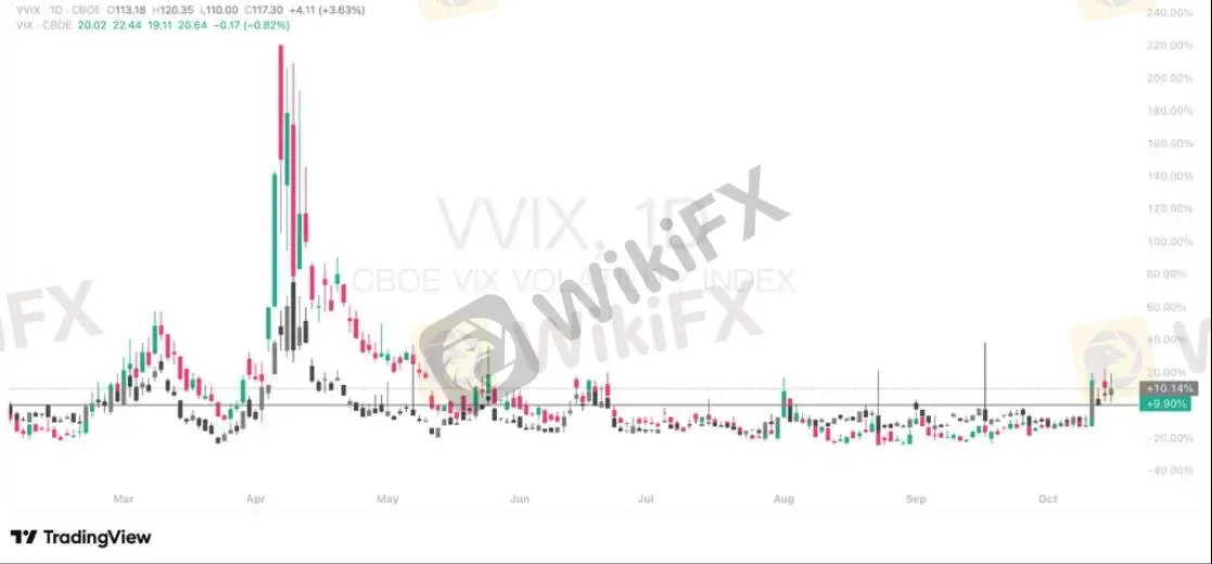 近期 VVIX(VIX波动率指数)延续上行,最新收于117.3,较前一日上涨3.6%,显示隐含波动需求上升,而 VIX 稍作回调至20.6,维持在关键心理关口之上。此种“VVIX上升、VIX横盘”的格局意味着市场对未来波动的预期正在升温,投资者开始积极买入波动性保护,但现货波动尚未全面爆发。若VVIX继续维持高位并带动VIX突破22,将可能触发短线风险资产的调整;反之,若VIX回落至20下方,市场风险偏好有望回暖。