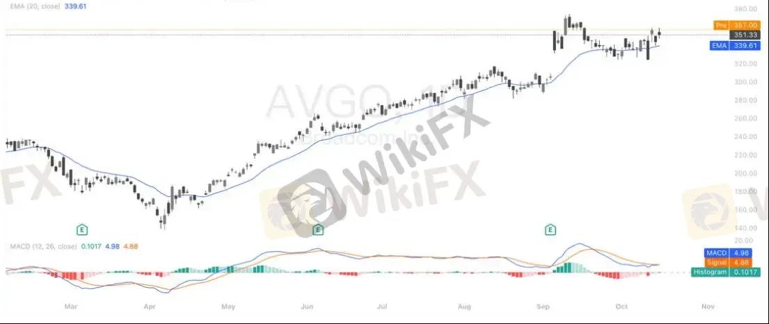 技术面显示,AVGO 日线图显示股价在回踩 20 日 EMA(339 附近)后企稳反弹,近期连续收阳并突破短期整理区间上沿,量能同步放大,显示买盘回归。MACD 双线金叉且柱状由负转正,动能恢复中。若能有效突破 357 前高区间,将确认多头延续结构,下一目标或看向 380-400 区间。