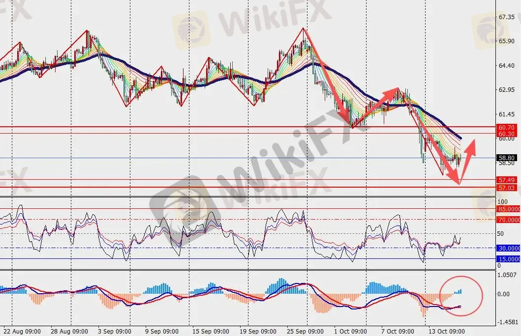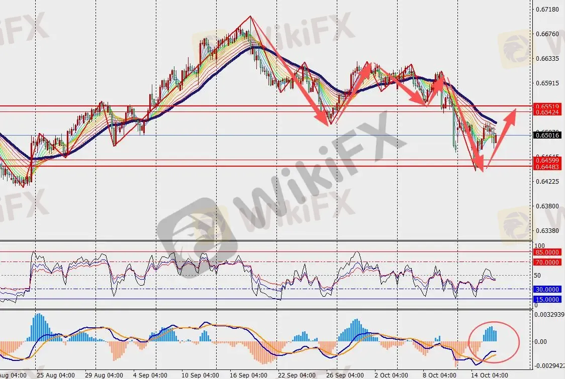 技术面:澳元兑美元H4级别下跌反弹,但依旧在48日多空分界线下方运行。此外,MACD双线和量能柱在零轴下方缩量。澳洲联储主席承认第二季度通胀略超预期,但强调通胀正持续朝着正确方向回落。