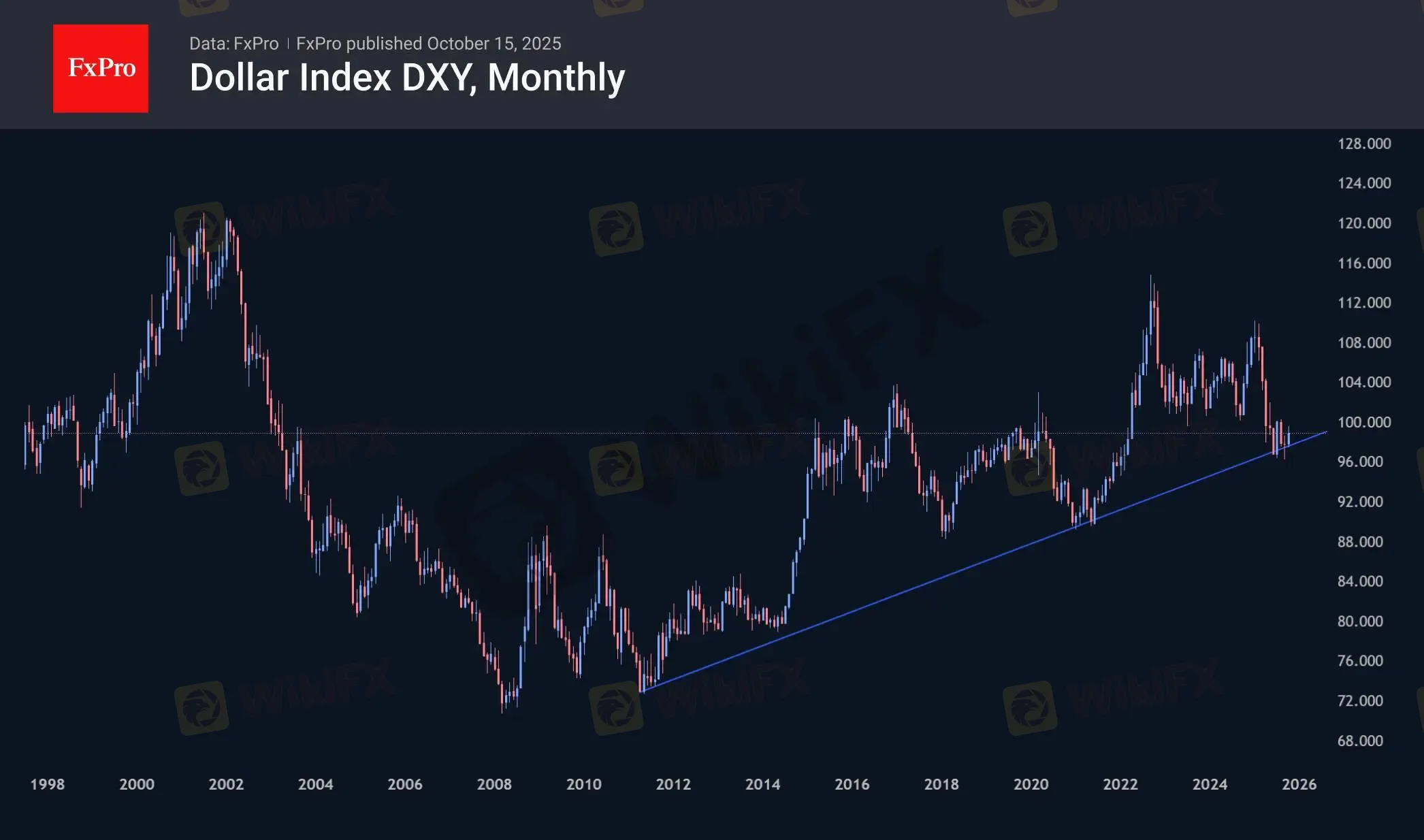 然而,从历史角度来看,当前时刻至关重要。自夏季以来,美元指数一直在 13 年上升趋势的支撑线附近交易。美元若跌破 96,可能意味着长期增长周期的突破,上一次出现这种情况是在 2002 年,再之前则是 1985 年和 1969 年,当时美元从峰值到谷底分别下跌了约 40%、50% 和 30%。在当前情况下,这可能意味着美元指数将跌至 2008 年的低点,当时美元指数接近 70,甚至可能跌破这些历史低点。