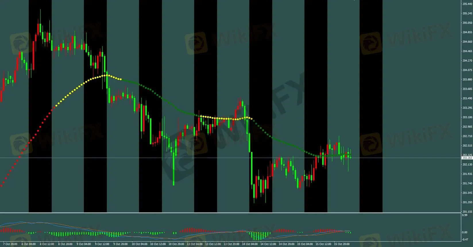 三色线绿色,此前203.7空单盈利70点出场。日内结合M5模型操作。