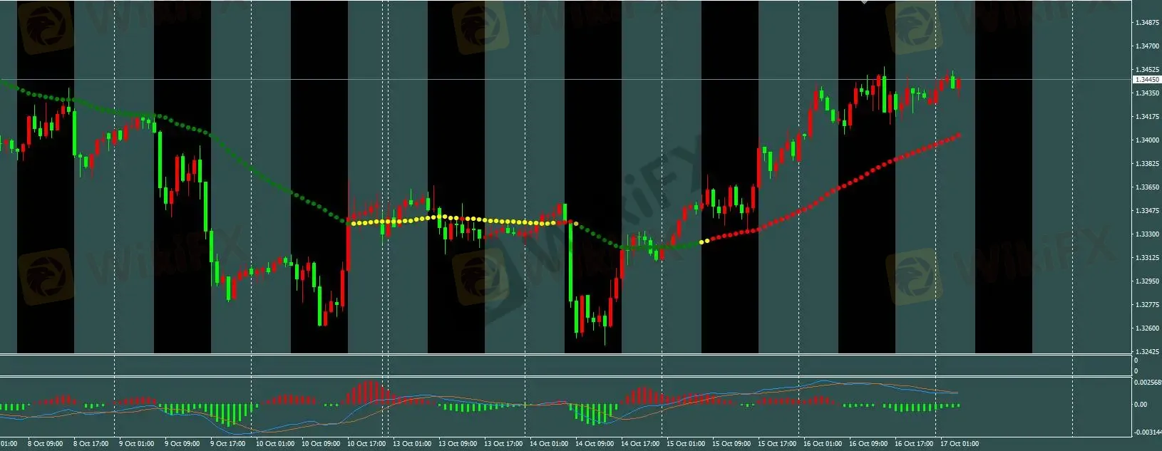 三色线策略:H1趋势线红色,此前1.3332多单盈利。今日参考M5模型短线交易。