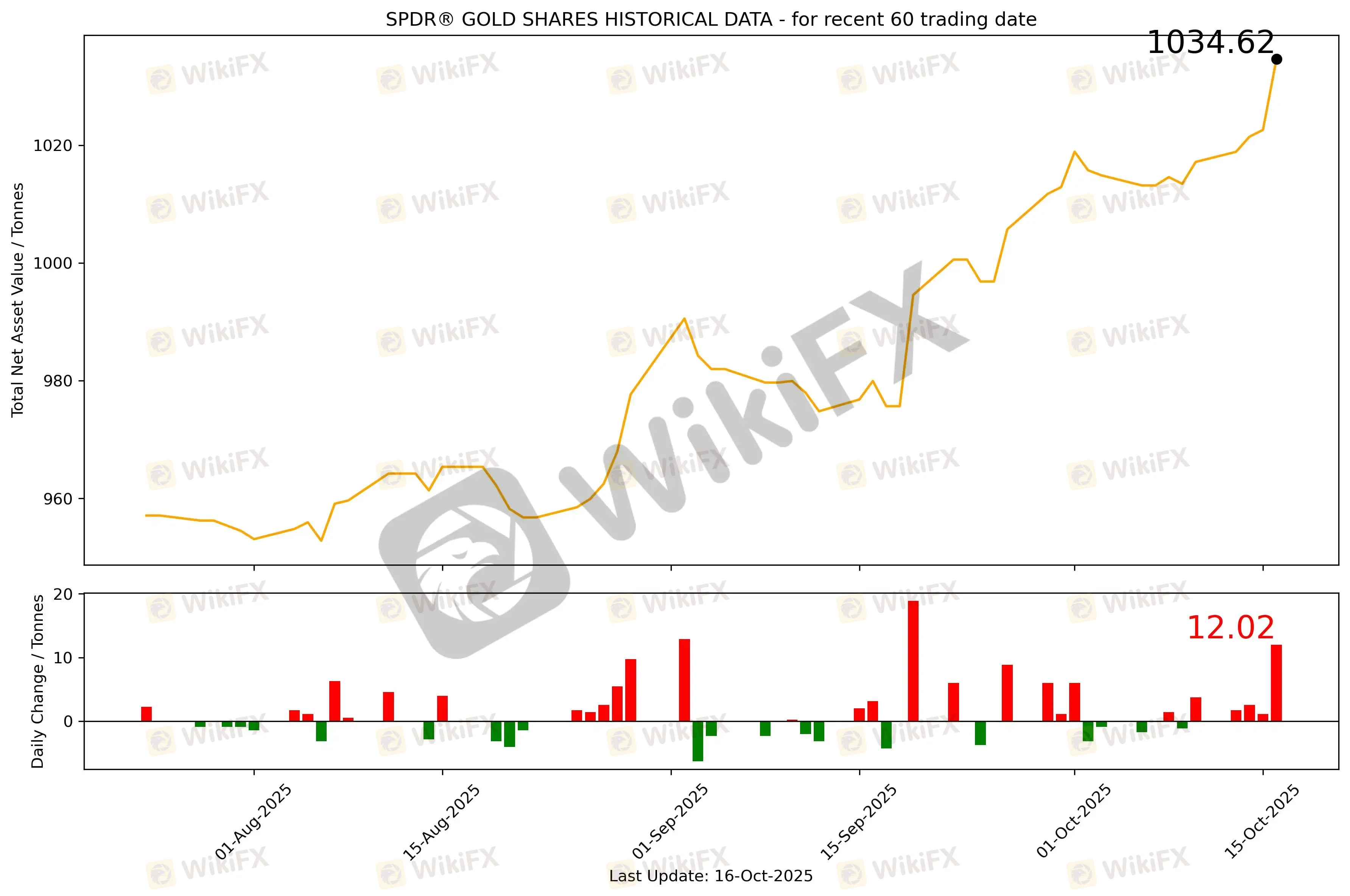 截至10月16日,全球最大的黄金ETF SPDR Gold Trust持仓量为1034.62吨,较上一个交易日增加12.02吨。10月16日现货黄金呈震荡上行后强势突破的走势特征。自4208.867美元/盎司开盘后全天最大跌幅不超过10美元,最高向上触及4330.66美元/盎司,最终收于4326.48美元/盎司,涨117.613美元或2.79%。