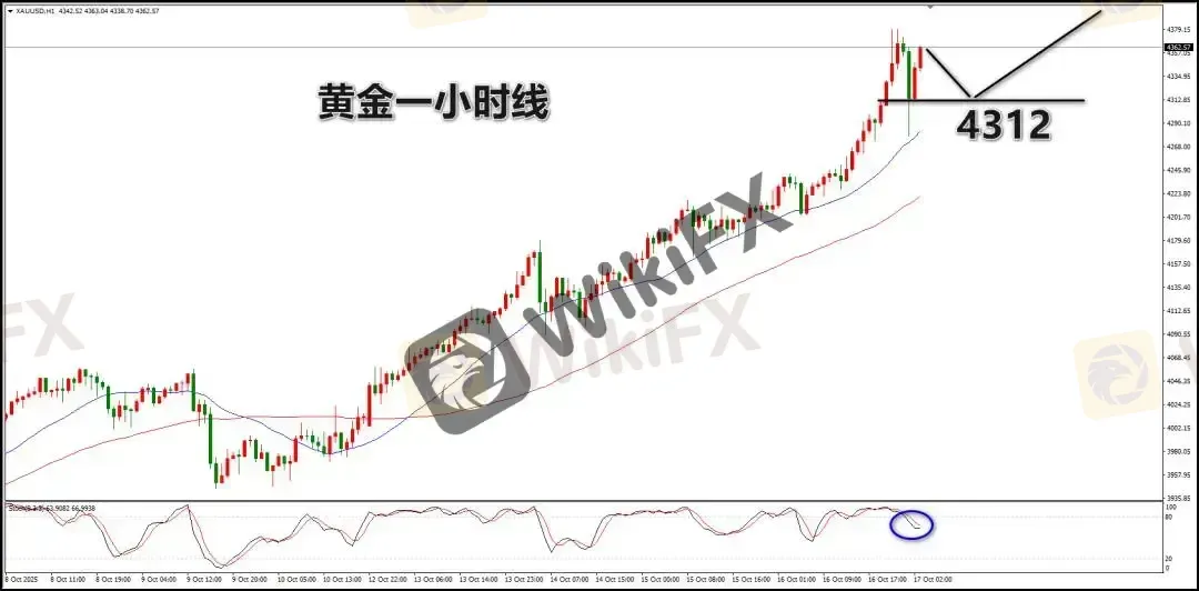 黄金一小时图,短暂虽有较大回调走势,但碰到支撑后再度上行,显示下方买盘较强;如后续回调支撑未被跌破,则走势将继续上行,故建议短多操作。