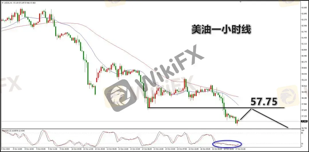 美油一小时图,反弹压力后再度下行,且下跌刷新近期低点,显示卖压较大;如后续反弹压力未能突破,则走势将继续下行,故建议短空操作。