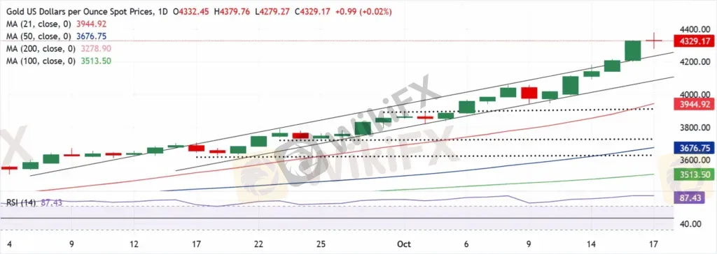 摘要:黄金创纪录的涨势停滞在 $4,400 点以下;买家似乎稍事喘息。美元在美中贸易紧张局势、美联储鸽派言论和政府关门延长的背景下舔舐伤口。黄金有可能因获利回吐而进一步回调,因为日线 RSI 仍处于极度超买状态。黄金在上周五亚洲交易时段经历了剧烈波动,受获利回吐和风险厌恶资金流的推动,最近的抛物线上涨至 $4,380 附近的历史新高。黄金在 $100 区间内震荡,有望实现连续第九周上涨。本周黄金有望实现