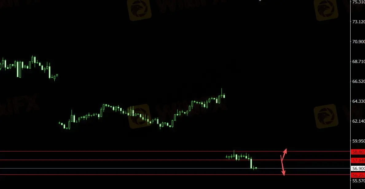 美元指数承压,原油下跌,关注支撑位56.250,4小时看多至58.800;关注压力位57.850,4小时看空至55.480。