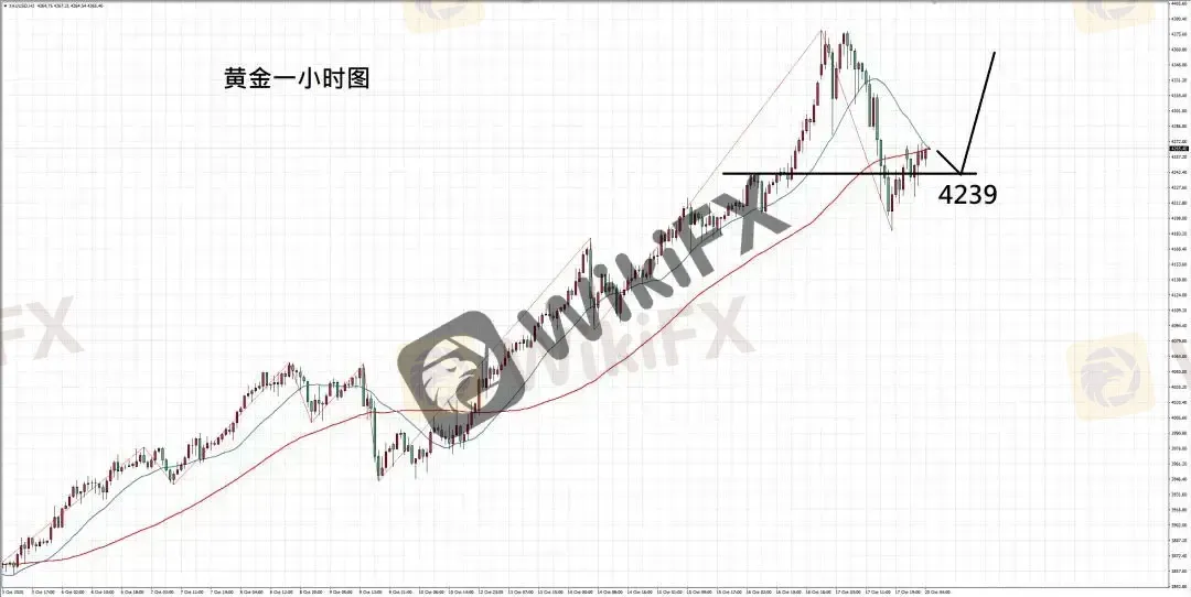 摘要:【基本面分析】昨日美国总统特朗普表示,对中国征收的100%关税难以长期维持,市场解读为中美贸易关系或出现缓和迹象,避险需求因此降温。叠加黄金近期涨势过快,价格出现技术性回调。不过在实体需求面,亚洲实金买盘因印度节庆旺季而大幅增加,各国央行亦持续增持黄金储备,为金价提供中长期支撑。整体来看,尽管短线涨多回落,但黄金多头趋势仍具延续空间。【技术分析】黄金一小时图,走势回测支撑后回升,并刷新短线高点,反