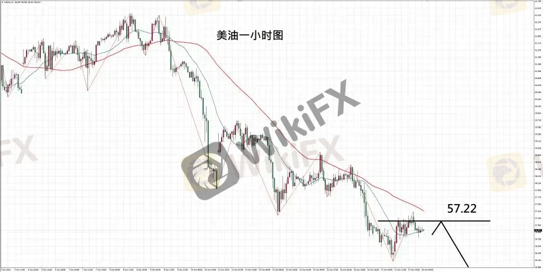 美油一小时图,走势向下跌破前期低点,高低点持续下降,反映卖压增强;如后续反弹受阻,则走势或继续向下,故建议短空操作。