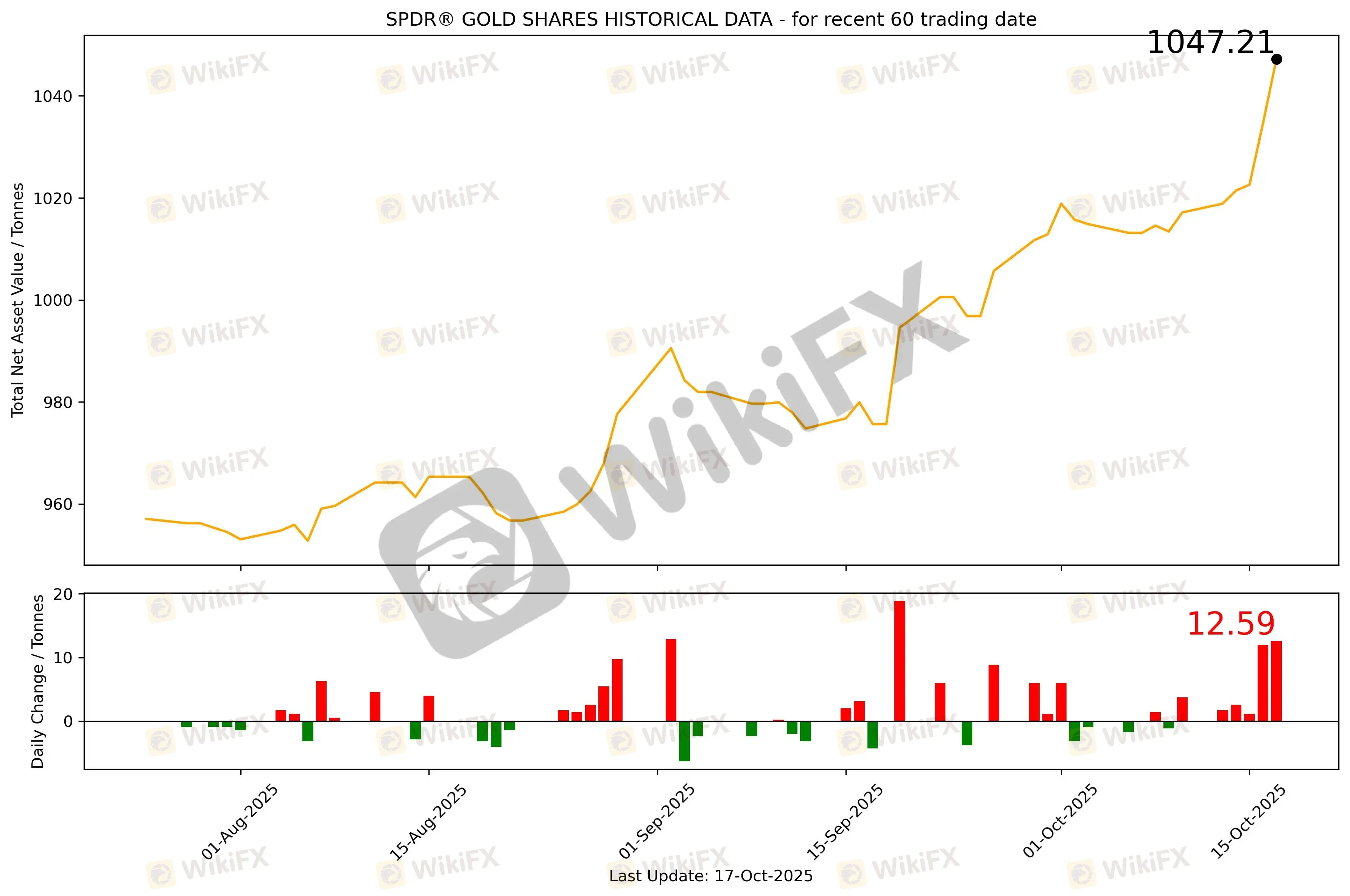 截至10月17日,全球最大的黄金ETF SPDR Gold Trust持仓量为1047.21吨,较上一个交易日增加12.59吨。10月17日现货黄金亚盘交易时间冲高至4380.79美元/盎司后跳水进100美元至4280美元/盎司附近,后迅速拉升,再度试探4380美元后震荡走弱;欧盘开盘后震荡下行,美盘交易时间继续跳水,最低向下触及4186.19美元/盎司,最终收于4250.93美元/盎司,跌76.285美元或1.76%。
