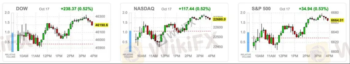 摘要:大盘回顾贸易局势缓和提振市场信心,美股反弹收高美东时间周五,美股三大指数低开高走,全线收涨。市场受益于中美贸易局势缓和预期与区域银行财报优于预期,投资者恐慌情绪显著降温。截至收盘,道琼斯指数上涨 238.37 点(+0.52%) 至 46,190.61 点;标普 500 指数上涨 34.94 点(+0.53%) 至 6,664.01 点;纳斯达克指数上涨 117.44 点(+0.52%) 至 22
