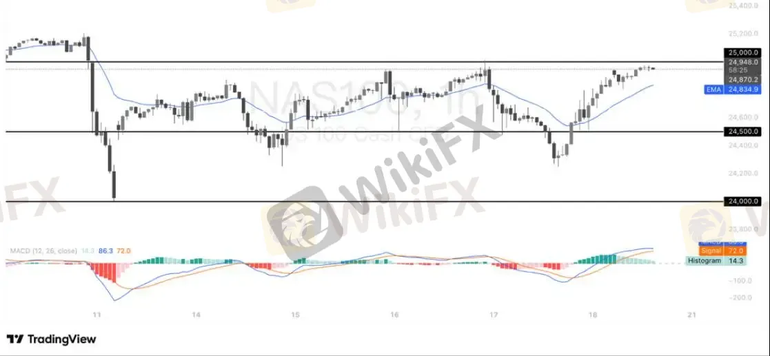 纳斯达克100指数(NAS100)在1小时图上维持区间震荡结构,价格目前逼近25,000上方压力位,短线多头动能放缓。MACD柱状图虽仍为正值,但动能增速趋缓,显示上行动能减弱。若价格未能有效突破25,000关口,短线或将回调测试24,870–24,500支撑区;反之,若放量突破25,000,将有望延续反弹趋势。