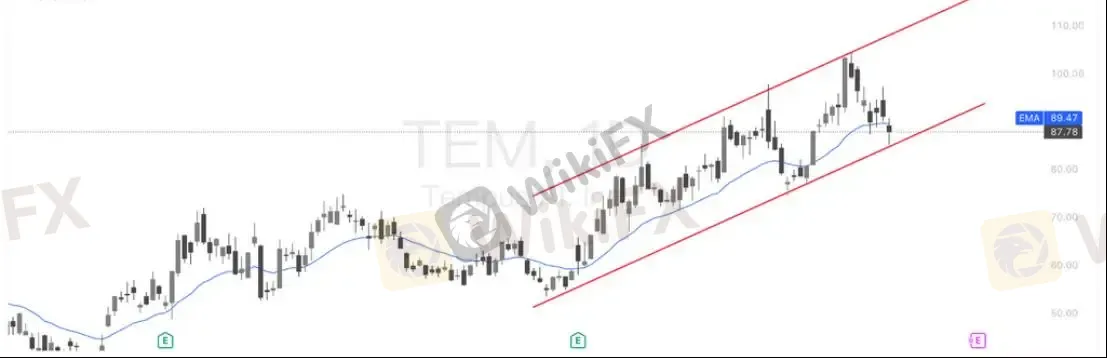 Tempus AI(TEM)日线走势仍运行于上升通道内,当前回测通道下沿及20日均线支撑区域(约87–89美元),短线进入关键支撑考验。MACD动能柱转负显示短期动能减弱,若能在通道下轨获得支撑企稳,有望延续中期多头趋势;反之,若跌破该区域,则或将打开进一步回调空间。