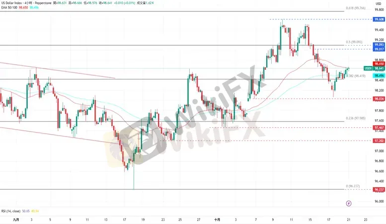 CPT Markets分析师指出,美元指数在98.069水平反弹,价格目前在测试EMA50水平,以重启自96.237开始的上涨趋势。上涨方面,美元指数目前的阻力为10月15日的高点99.017,再来是10月9日的高点99.608。下跌方面,美元指数目前的支撑为10月17日的低点98.069,接着是10月1日的低点97.482。