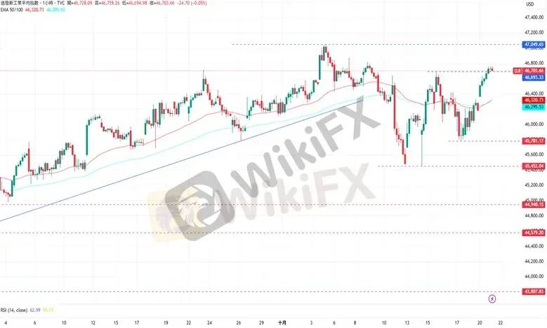 道琼指数突破了46700点的阻力水平,若能保持在上方,将准备向47000点水平移动。上涨方面,若道琼指数能维持在46693点上方,接下来的目标是10月3日的高点47049点。下跌方面,若回落至EMA50下方,道琼指数接下来的支撑为10月16日低点45781点,接着为10月14日的低点45452点。