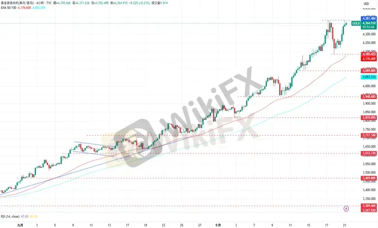CPT Markets分析师指出,黄金价格自自4185美元反弹,并重返历史高点,由于价格持续形成更高的低点,且上涨趋势完整,因此前景保持看涨。上涨方面,若确认突破4380美元的阻力水平,黄金接下来的目标为4400美元水平。下跌方面,黄金初步的支撑为10月17日低点4185美元,再来EMA50所在的4176美元。