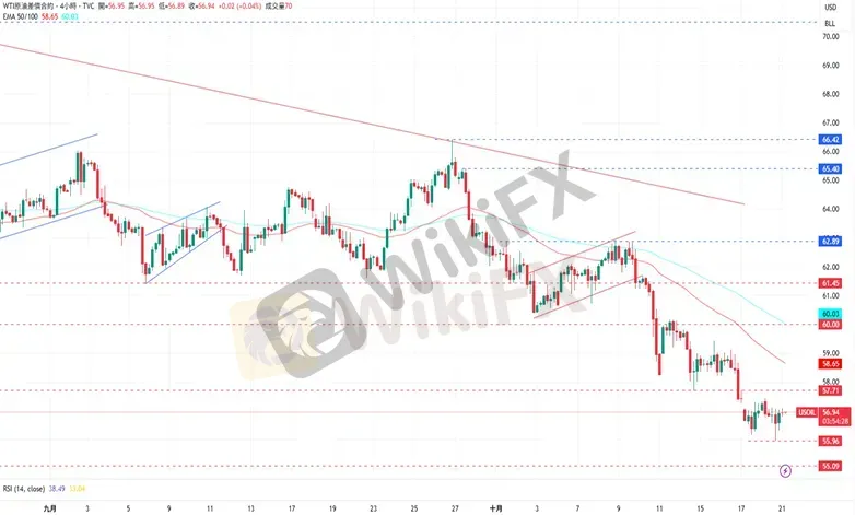 WTI原油保持在57.50美元下方波动,受EMA50以及下跌趋势线影响,价格走势持续保持看跌。上涨方面,WTI原油目前的阻力为10月20日的高点57.43美元,再来EMA50所在的58.65美元。下跌方面,WTI原油接下来的支撑为10月20日的低点55.96美元,再来是4月9日的低点55.09美元。