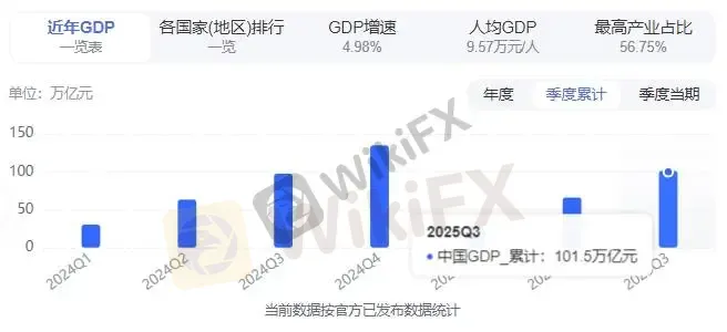 10月20日,国家统计局发布数据显示:2025年前三季度,我国GDP为1015036亿元,按不变价格计算,同比增长5.2%。三季度,中国GDP为354500亿元,按不变价格计算,同比增长4.8%。从环比看,经季节因素调整后,三季度GDP环比增长1.1%,比二季度回升0.1个百分点。今年以来,中国经济发展顶住压力,取得了难能可贵的发展成绩,经济运行持续保持总体平稳、稳中有进发展态势。