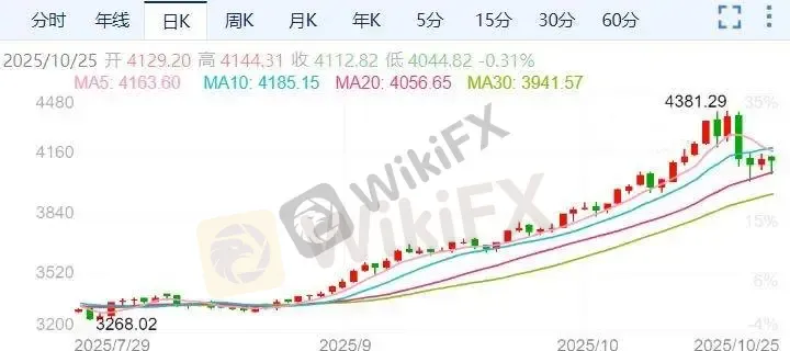 黄金本周经历了波动行情,周初先出现上涨,随后大幅下跌至4000美元支撑区间附近。成交量上升暗示可能正在形成顶部,而在近期抛物线式上涨后,回调至3800美元被视为健康的正常化走势。