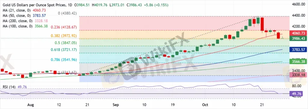 日线图显示,金价守住了 $3,973 的关键支撑位,这是 8 月中旬开始的抛物线式上涨的 38.2% 斐波水平。