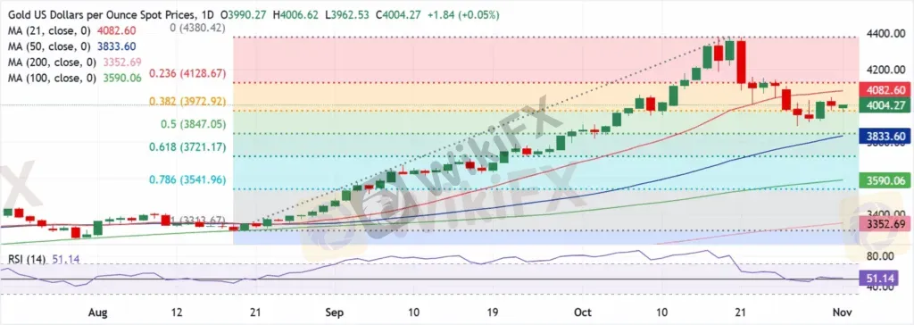 日线图显示,金价在上周五收于 $4,000 关口上方后,本周又在该关口附近徘徊。