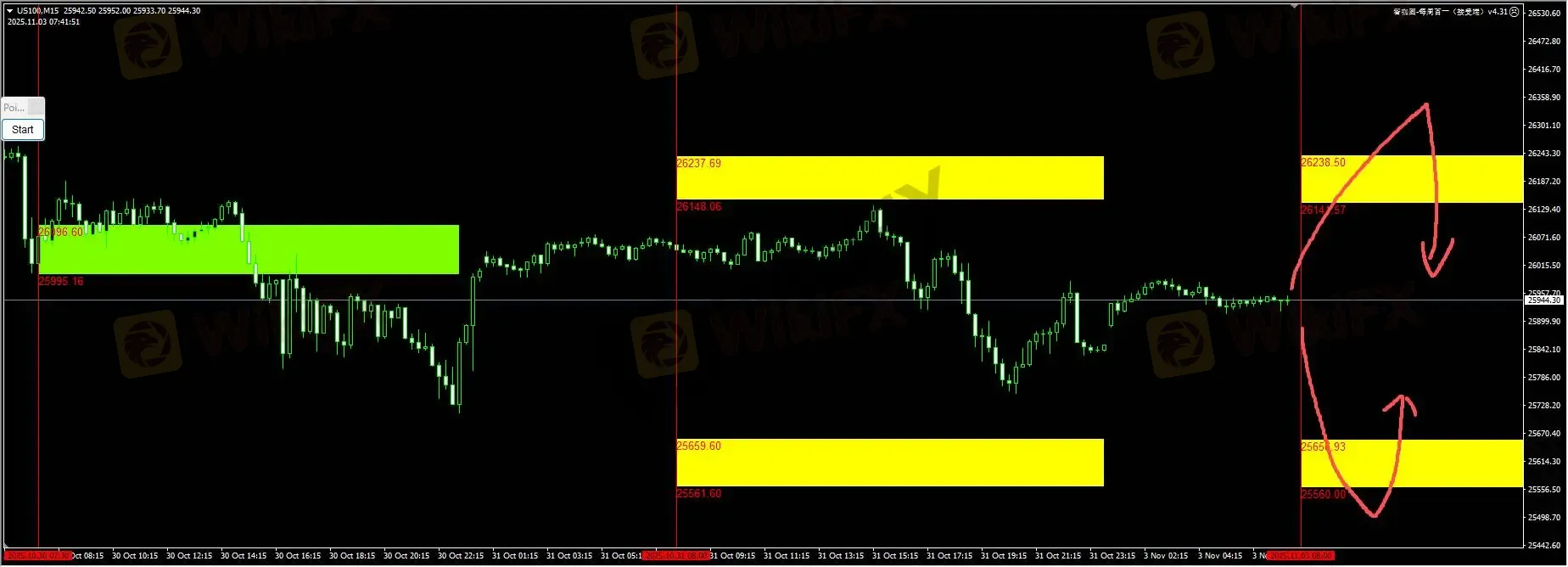 纳指:TACO交易的缓和,以及中美贸易协商可能出现进展,纳指继续刷新新高。上周五我们插件给到的2个黄色区域上下对扫,目前还没有触发。日内我们关注价格上下扫荡流动性之后的回调机会。详细位置请咨询插件。