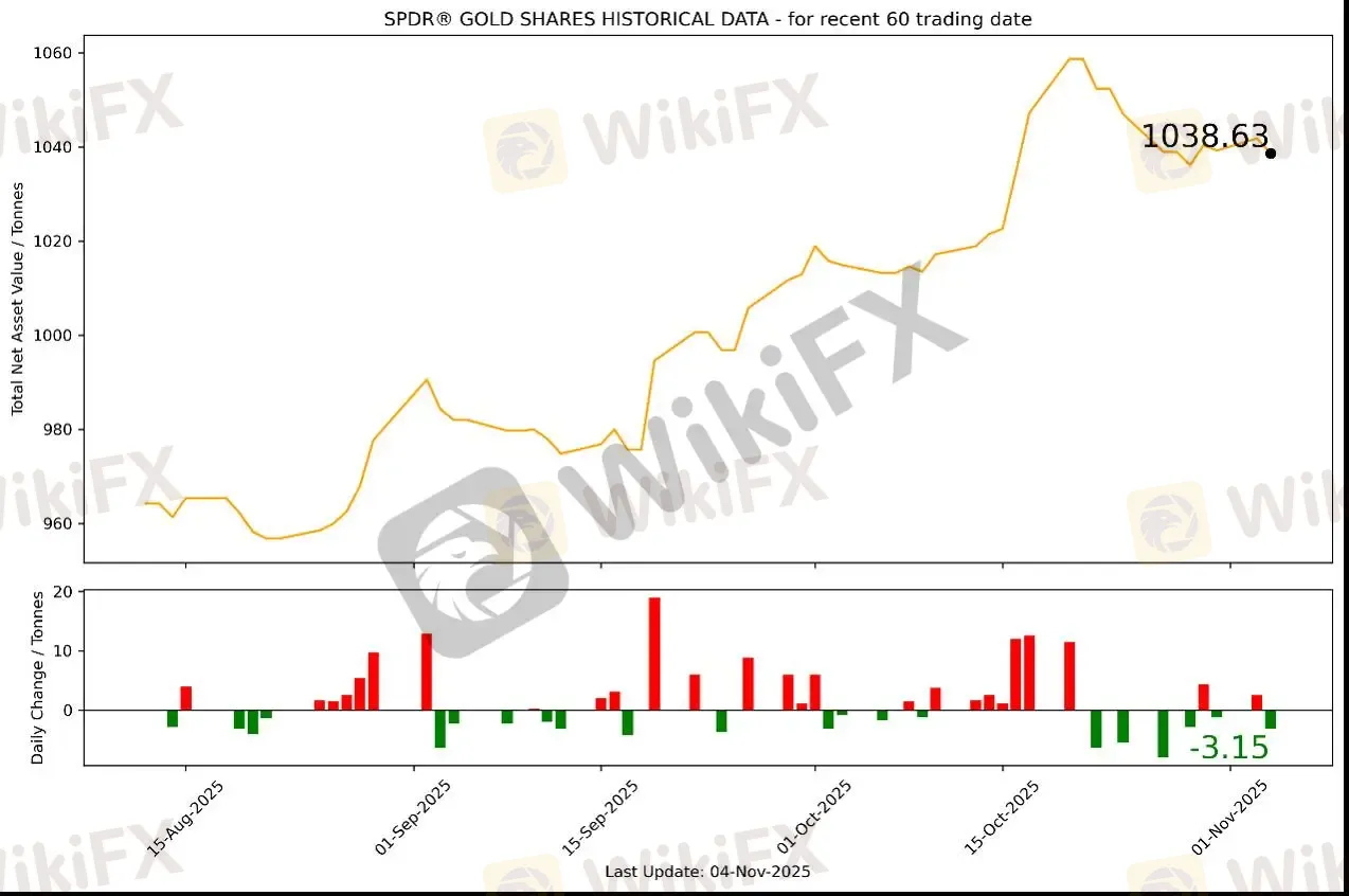 截至11月4日,全球最大的黄金ETF SPDR Gold Trust持仓量为1038.63吨,较上一个交易日减少3.15吨。11月4日现货黄金自4000.95美元/盎司开盘后承压下跌,亚盘交易时间向下触及3970美元一带后逐渐拉升,多头未能有效突破4000美元关口。美盘盘前高位回落,美盘交易时间大幅下跌至3928.92美元/盎司,最终收于3931.63美元/盎司,跌70.77美元或1.77%。