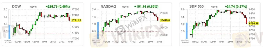 美股周三强势反弹,市场情绪在早盘后迅速转暖。盘前因投资者担忧 AI 相关企业估值过高,指数期货在亚洲时段一度走弱。不过随着股价回落至近一周低点,加上 10 月 ADP 就业新增 4.2 万人、薪资增速升至 6.7%,显示美国就业市场依旧具有韧性,市场悲观预期开始缓解,期货跌幅也显著收敛。