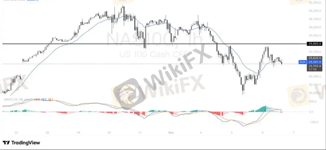 纳指 100(NAS100)在经历早前的快速反弹后,短线动能出现明显降温迹象。价格于小时级别在触及 25,800 关键前高后遇阻,多次测试未能突破该区,显示上方抛压依旧沉重。当前价格重新跌回 20EMA 下方,反映短线趋势由强转弱,买盘力度有所减弱。