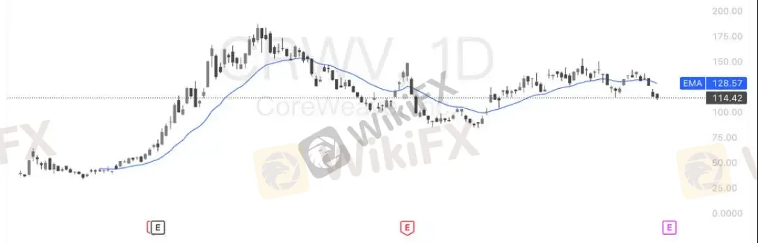 技术面显示 CRWV 处于回调整理阶段。股价已跌破 20 日均线(EMA 128.6),回测前期震荡密集区,短线支撑位于 110–115 美元。若能守稳 110 美元并伴随量能回补,反弹机会将增强;反之失守,将可能下探 100 美元整数字关口。