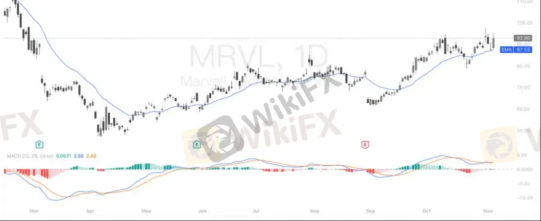 技术面显示,MRVL 股价已稳站 20 日均线(EMA 87.5) 之上,并在均线获得有效支撑后快速反弹至 90 美元上方。MACD 虽处于高位横盘,但仍维持在零轴上方,趋势偏多。若能成功突破 95–97 美元压力区,上方将有机会挑战 100 美元整数关口;下方则以 87–88 美元为关键支撑,未跌破前,中短线结构仍偏向多头延伸。