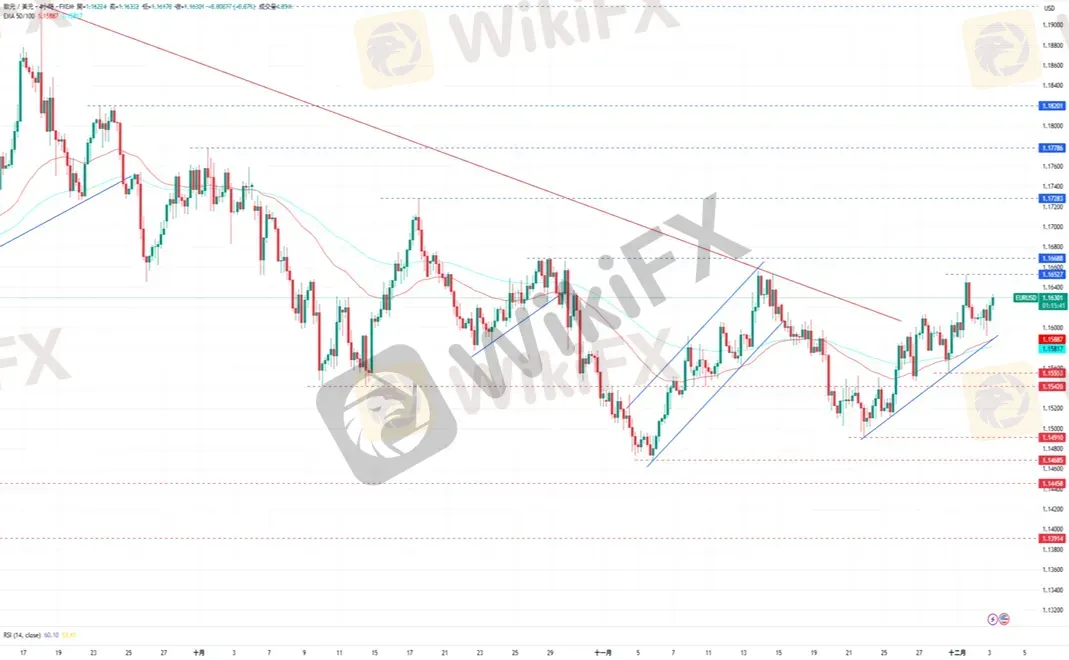 周二,衡量美元兑六种主要货币的美元指数下跌至99.337。由于周二没有重要的美国经济数据公布,市场交投氛围清淡。此前,周一公布的11月ISM制造业采购经理人指数(PMI)弱于预期,进一步强化市场对政策转向的预期。美国总统特朗普周二表示,他将于明年初宣布接替鲍威尔出任美联储主席的人选,并明确暗示人选为哈塞特。若由哈塞特担任新任主席,由于市场普遍视其为偏鸽派,可能对美元造成压力。展望后市,周三美国将公布11月ADP就业人数、9月工业产出月率以及11月ISM非制造业PMI。