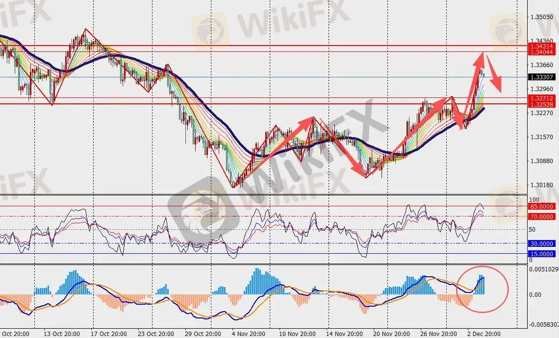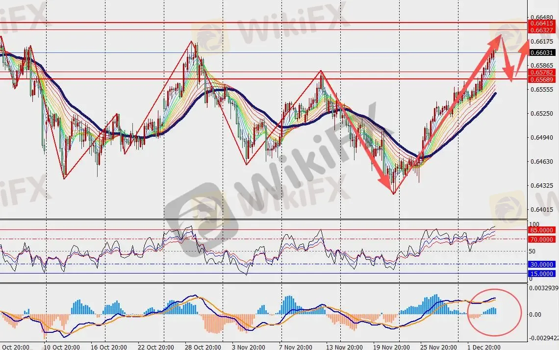 技术面:英镑兑美元H4级别大幅上涨,并在48日多空分界线上方运行。另一方面,MACD双线和量能柱在零轴上方顶背离缩量。在消费者信心低迷和劳动力市场出现疲软的背景下,工党预算案中的房产措施不太可能对房地产市场产生重大影响。