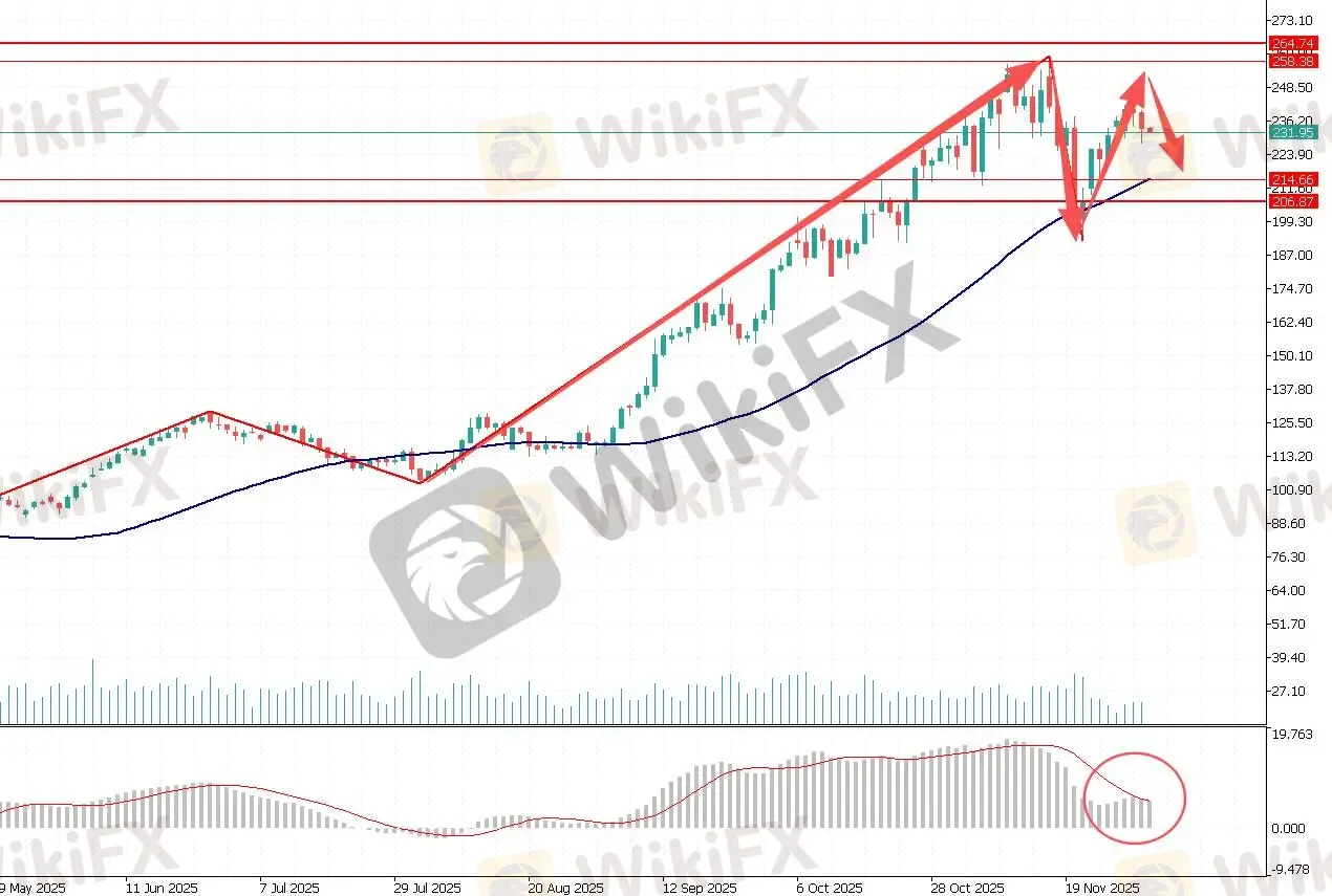技术面:美光日线级别遇阻回落,但依旧在48日多空分界线上方运行。然而,MACD双线和量能柱在零轴附近顶背离缩量。在存储超级周期这一牛市逻辑强劲驱动之下,美光股价今年迄今大幅上涨约175%。
