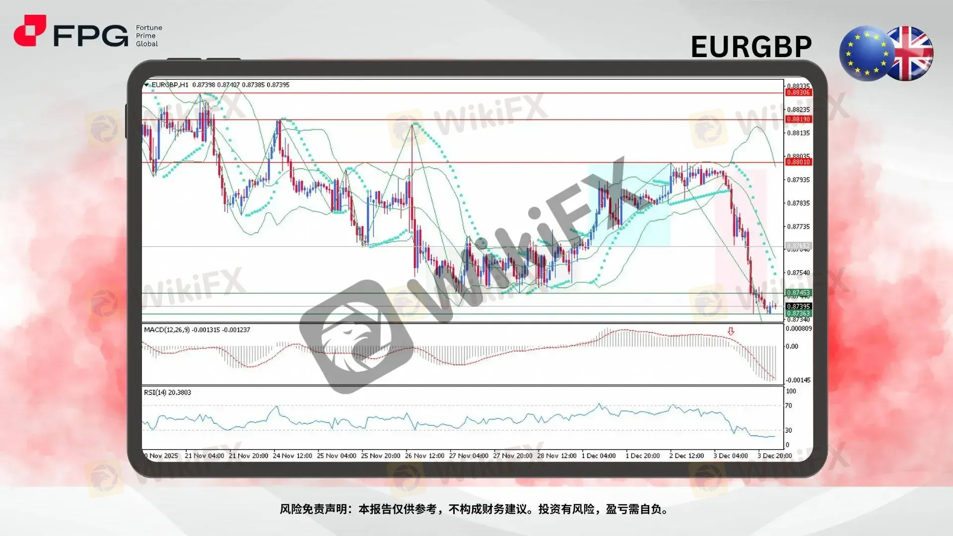 摘要:EURGBP 在价格多次于 0.8801 附近遭遇拒绝后出现强劲的空头走势,随后大幅下跌至 0.8736。目前该货币对位于 0.8739 附近,在多次跌破日内支撑后形成了明显的下行延伸,显示市场动能已明显转向卖方。尽管跌幅猛烈,但价格行为仍高度敏感,使 EURGBP 处于一个关键区域,市场将在此决定是继续扩大跌势还是启动修正性反弹。技术指标显示空头动能占据主导,大实体K线沿布林带下轨运行,抛物线S
