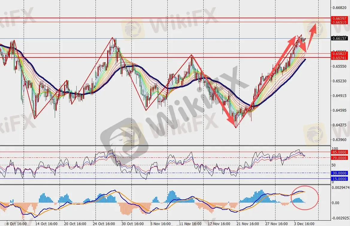 技术面:澳元兑美元H4级别持续上涨,并在48日多空分界线上方运行。然而,MACD双线和量能柱在零轴上方顶背离缩量。市场有充分的理由认为澳大利亚经济将在未来几个季度保持平稳运行。