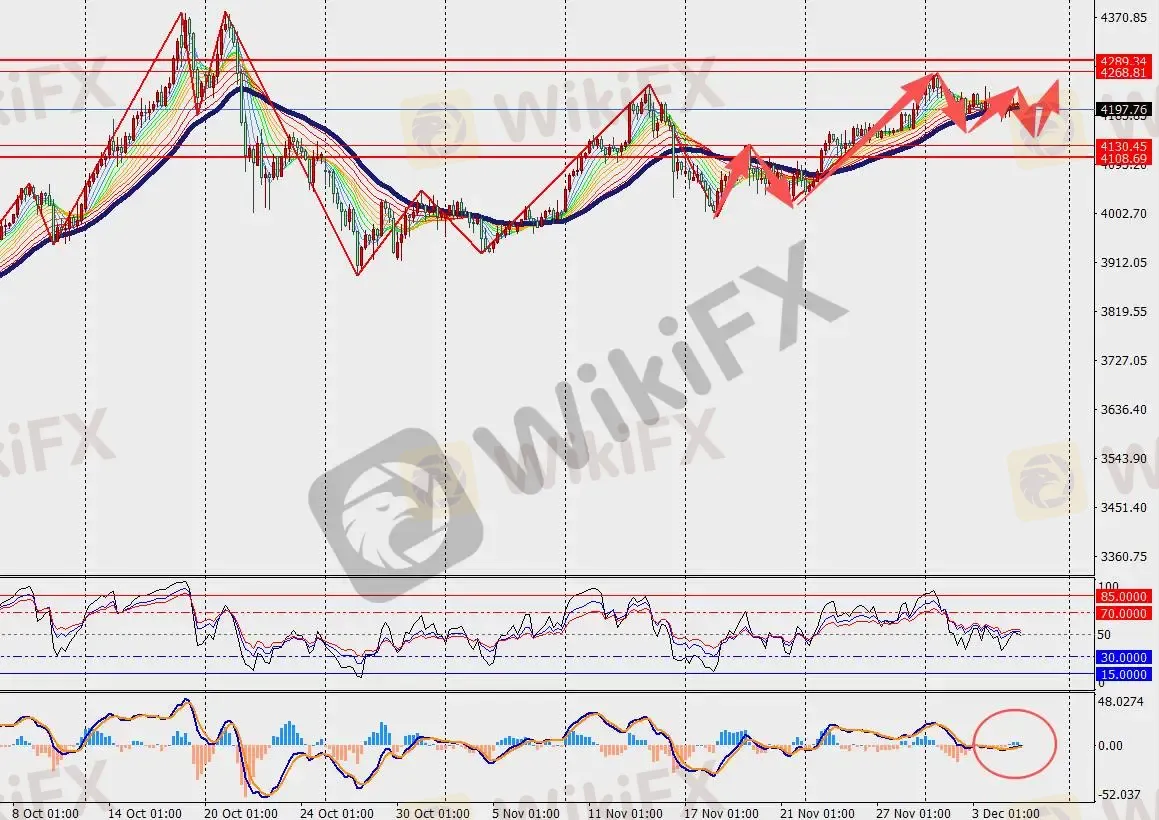 技术面:原油H4级别遇阻回落,并依旧在48日多空分界线上方运行。另一方面,MACD双线和量能柱在零轴上方缩量。惠誉评级下调了2025-2027年油价预期,理由是持续的供应过剩以及预计产量增长将超过需求增长。