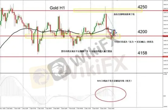 最新的H1图,12 月降息预期持续影响金价走势,但市场在 4250 高位出现明显获利了结,金价再度回到 4200 下方震荡。此区既是短线多空分水岭,也是技术面结构的关键转折点。