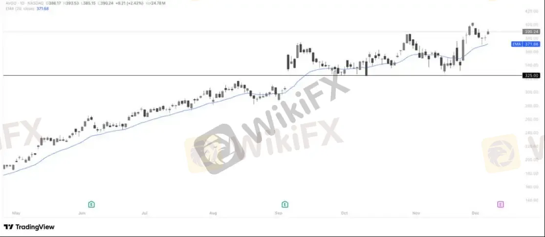 博通在财报前维持强势结构,股价自回踩 20 日均线后迅速企稳并再度向上,显示多头买盘积极承接;价格仍处于高位震荡区间上方,整体趋势保持健康。短期重点关注能否在财报催化下突破近期高点并延续上行节奏,而只要 20 日均线持续走升且不被跌破,技术面仍偏向“强势整理后再攻”的节奏。
