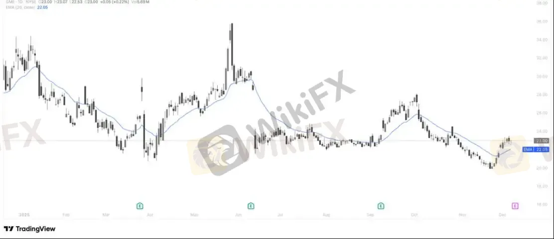 GameStop 近期自低位反弹后企稳于 20 日均线上方,短线趋势有所改善,但整体仍处于年内大区间的中下部,属于“弱势中的阶段性修复”。当前股价在 23 美元附近面临前期密集成交区阻力,而反弹力度暂未形成有效突破动力;不过均线开始走平并轻微上拐,显示空头动能已明显减弱,资金正等待财报催化决定方向。若财报兑现基本面拐点,站稳并放量突破 24–25 美元区间,有望确认短期反转;若遇阻回落,则可能重新进入 20–22 美元的震荡整理区。总体而言,技术面偏中性偏修复,方向仍需财报给出进一步信号。