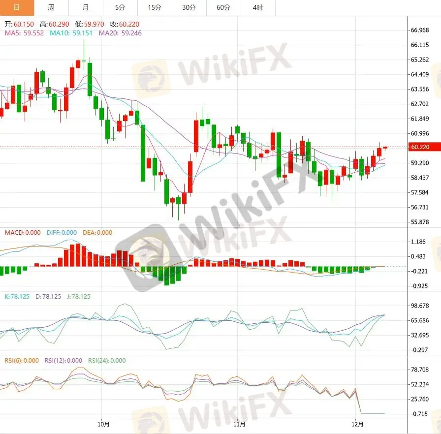 从美原油(WTI)日线级别来看,价格持续运行在短期均线附近,整体呈现低位震荡上扬的结构。近期 K 线多次在 60 美元关口上方获得支撑,显示多头力量在关键整数位维持韧性。短期均线向上拐头并尝试与中期均线形成新的多头排列,表明若地缘供应扰动持续,价格仍有可能向上测试 61.5 — 62 美元一线的压力区。