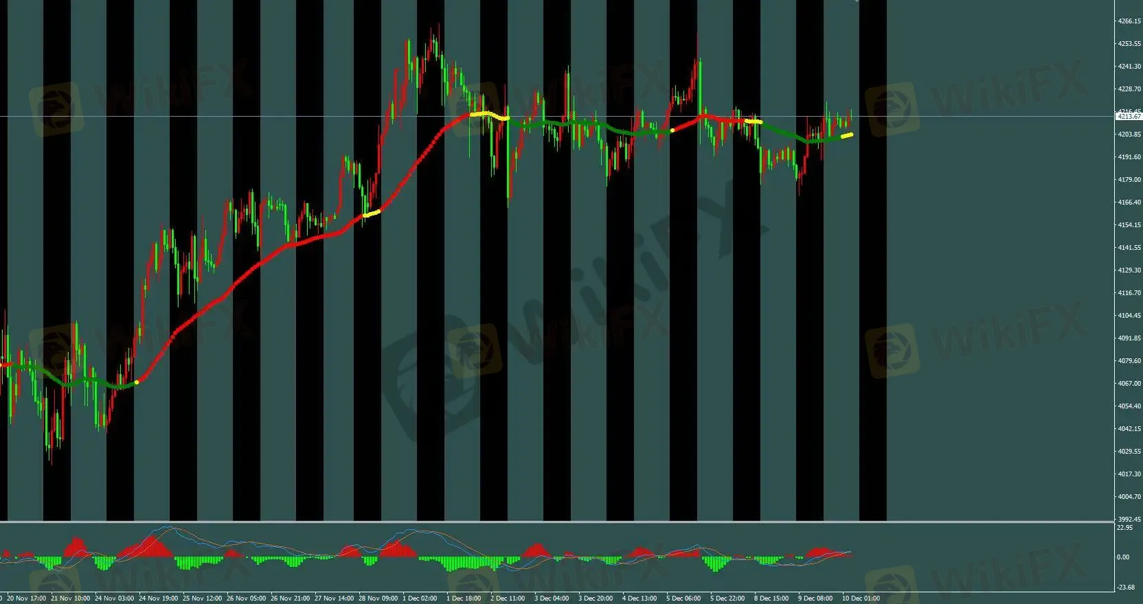 目前 H1 周期三色线已由绿转黄,标准空单已于 4200 附近入场,止盈 150 点,保护性止损设于开仓位上方 250 点,或于三色线转红时平仓。日内短线可结合 M5 基础模型进行操作。