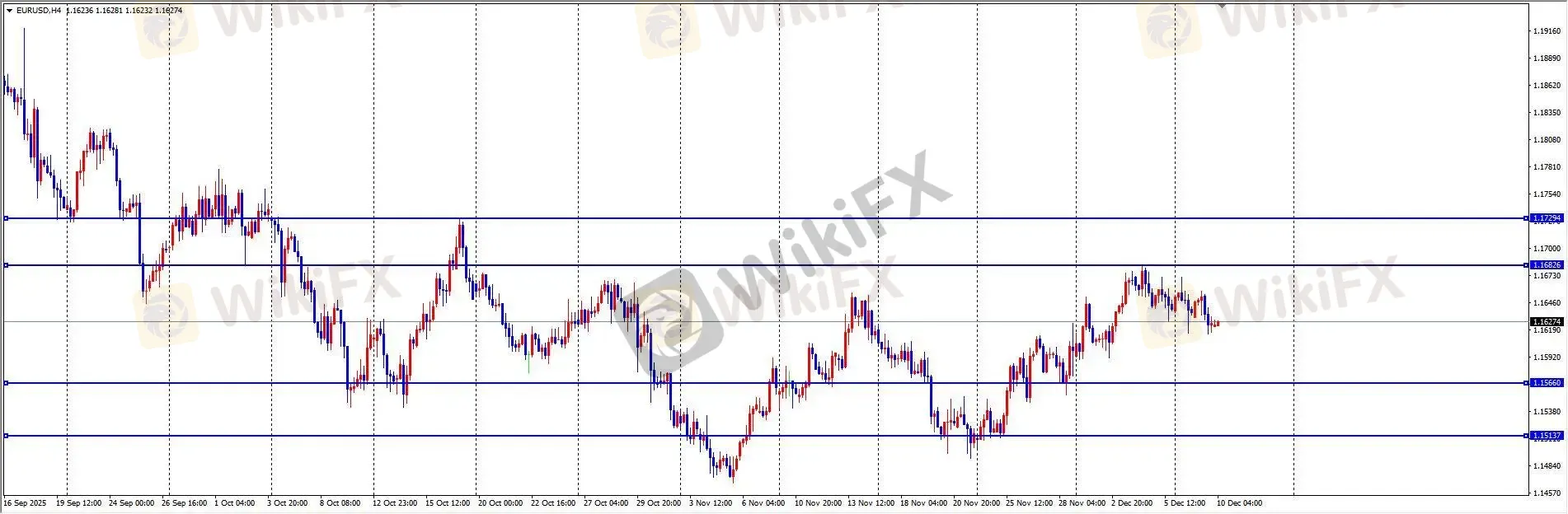 周二,欧元/美元小幅震荡下行,最低触及 1.1615 后盘整,全天波幅约 55 点,日线收于带影线的阴线。德国 10 月出口数据优于预期带来提振,但市场在美联储决议前态度谨慎,美国强劲的劳动力数据支撑美元。ETO Markets 认为,汇价短期内或维持震荡格局。