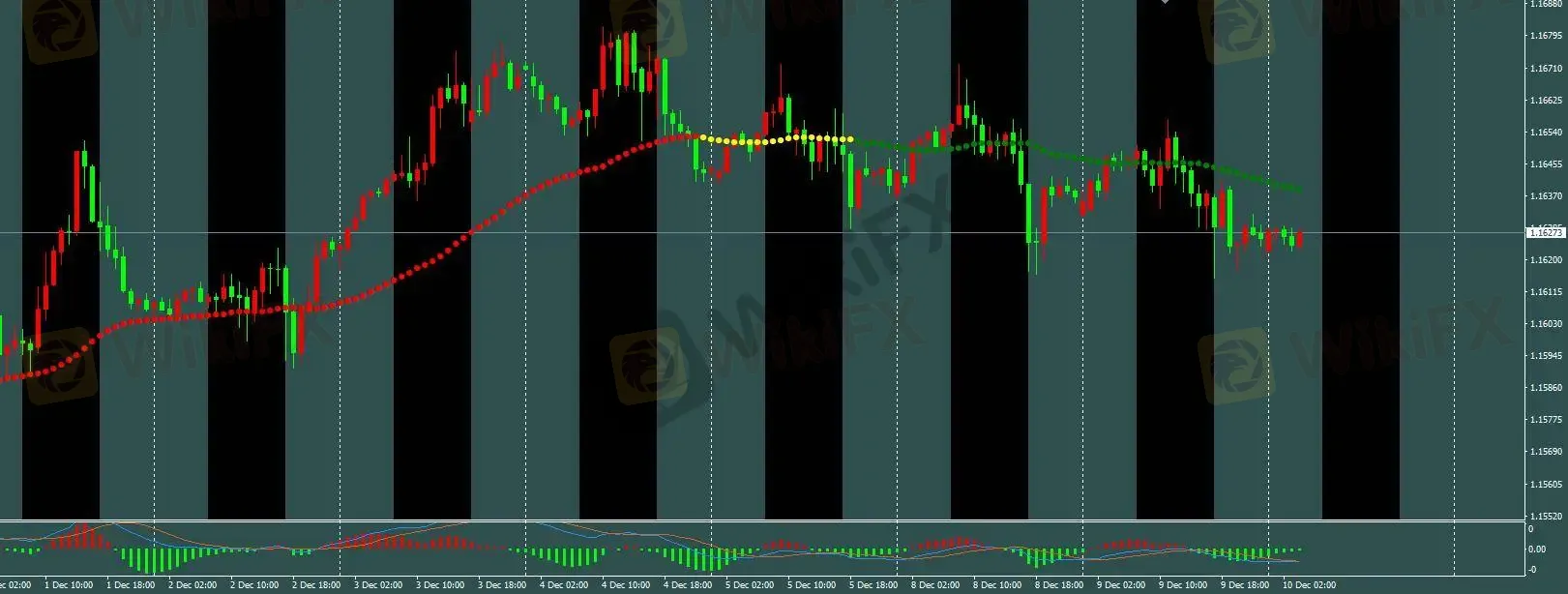 H1 趋势线维持绿色,已按模型在 1.1650 附近入场空单。保护性止损设于 1.1720 附近,盈利目标为开仓价下方 50 点,趋势线转红即平仓。