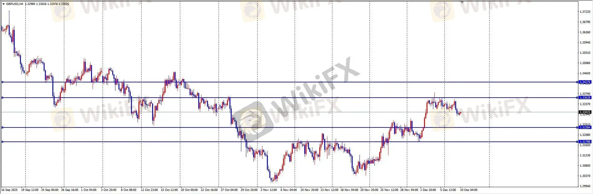 周二,英镑/美元冲高至 1.3356 后回落,最低触及 1.3287,全天波幅约 69 点,日线收于带影线的阴线。英国央行官员表态倾向于逐步降息,而美国强劲数据支撑美元,令汇价承压。ETO Markets 认为,镑美短期可能延续震荡偏弱走势。