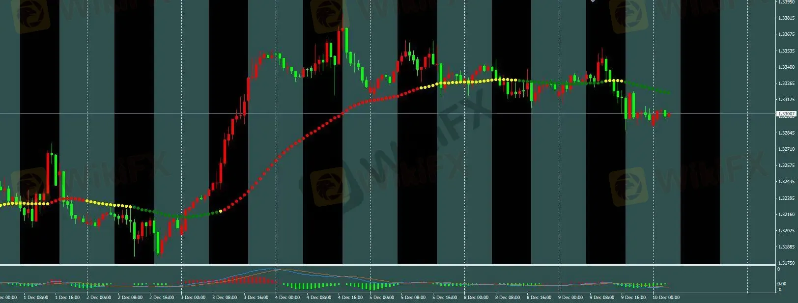 H1 趋势线已由黄转绿,已按模型在 1.3327 附近入场空单。保护性止损设于 1.3400 附近,盈利目标为开仓价下方 60 点,趋势线变红即平仓。