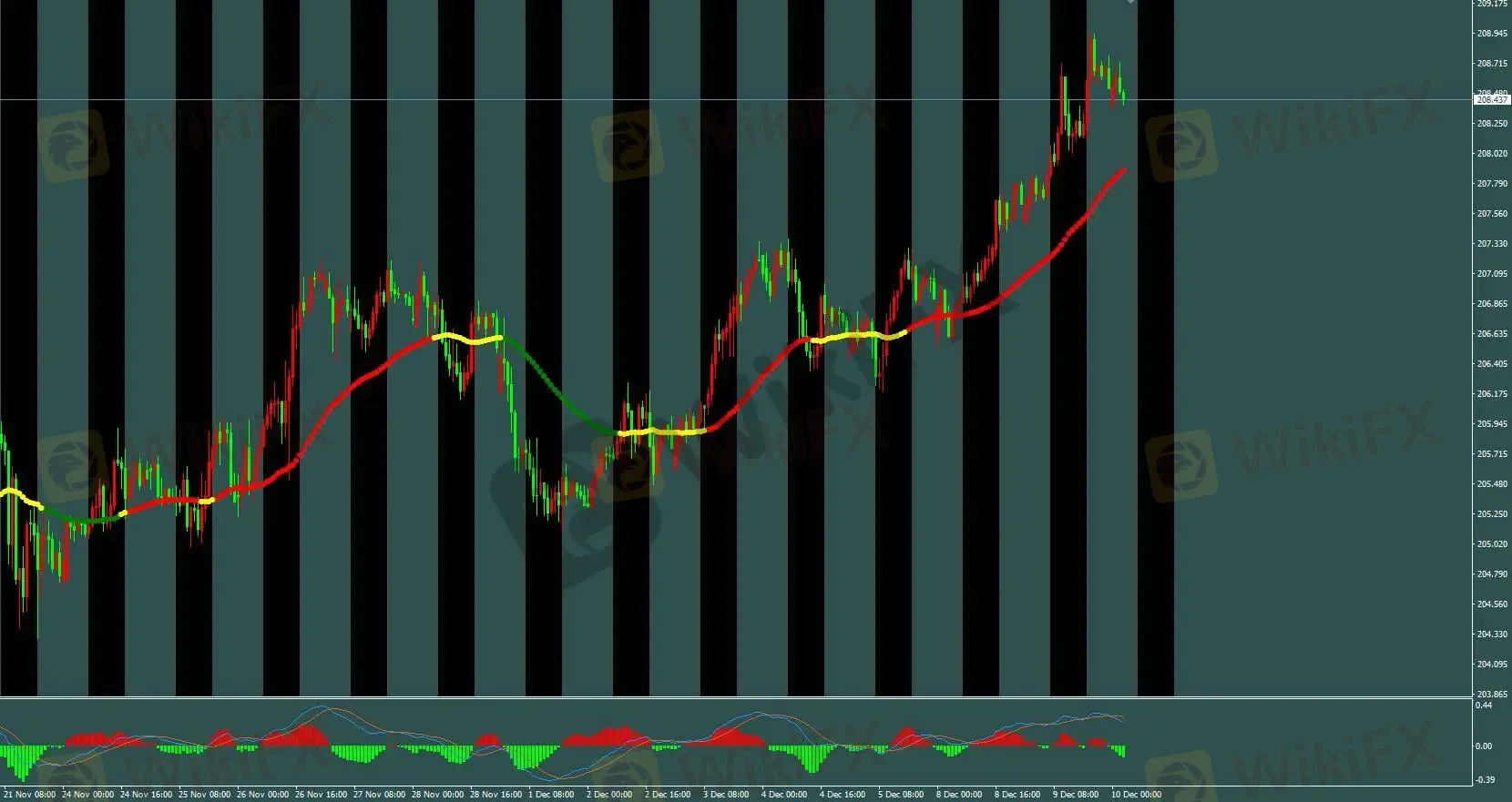 目前 H1 三色线维持红色,标准多单已于 206.00 附近入场并盈利 70 点出场。日内建议根据 M5 基础运用模型进行短线操作。