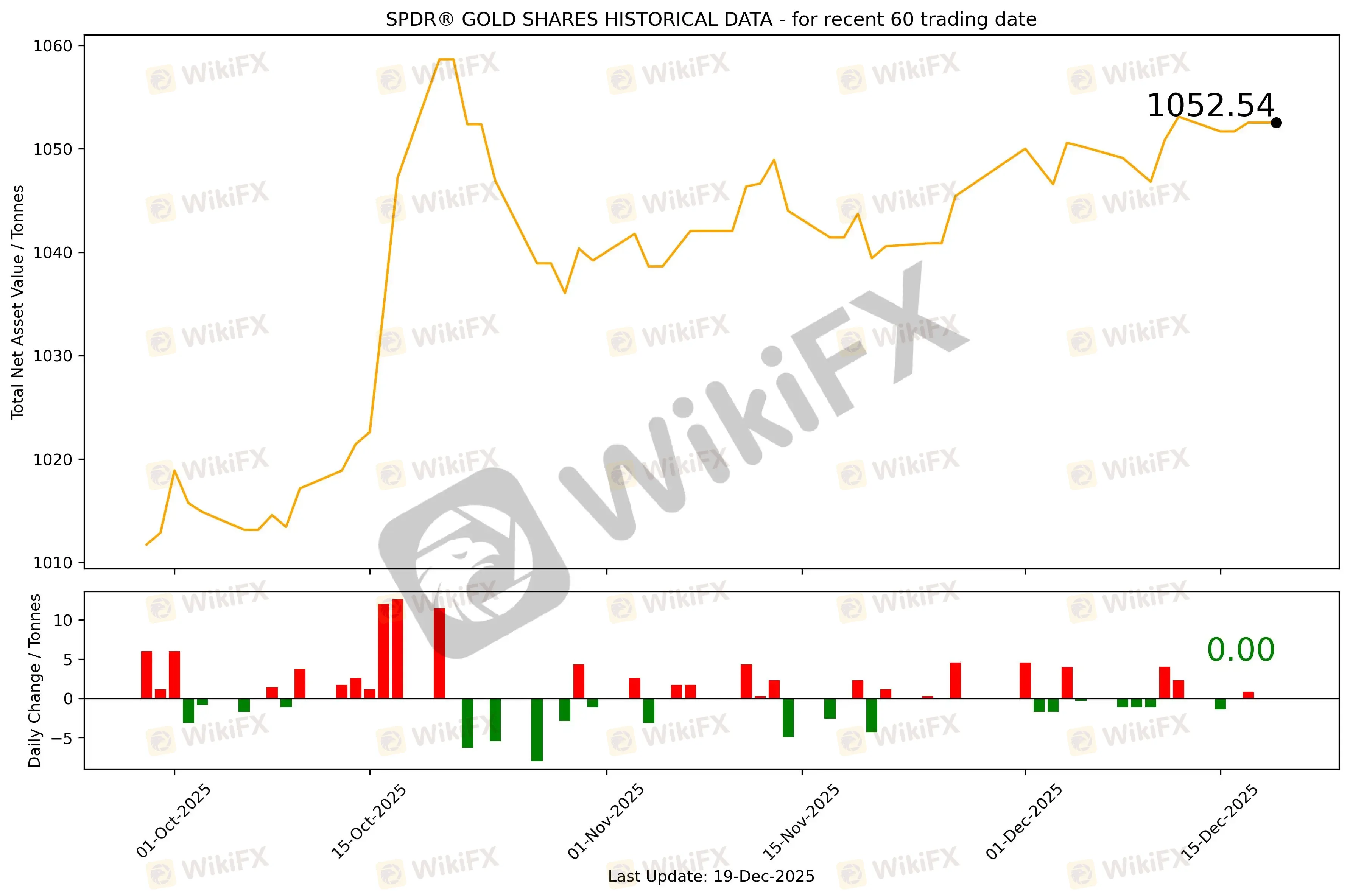 截至12月19日,全球最大的黄金ETF SPDR Gold Trust持仓量为1052.54吨,较上一个交易日维持不变。12月19日现货黄金自4332.51美元/盎司开盘后一路下行至4309.37美元/盎司,随后震荡上行,最高向上触及4356.59美元/盎司。最终收于4338.669美元/盎司,涨6.159美元或0.14%。