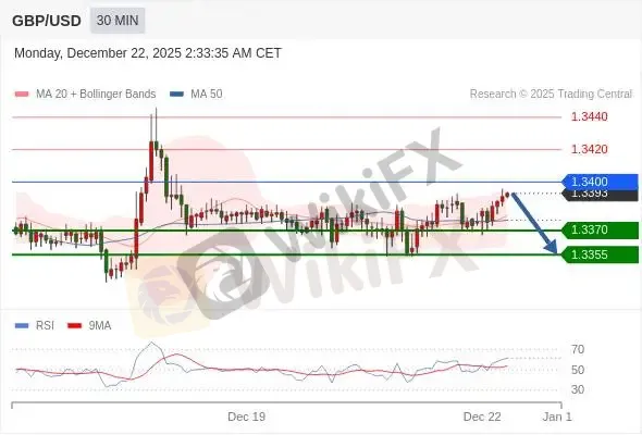 当日内短期关键阻力位在1.3400,转折点在1.3400。