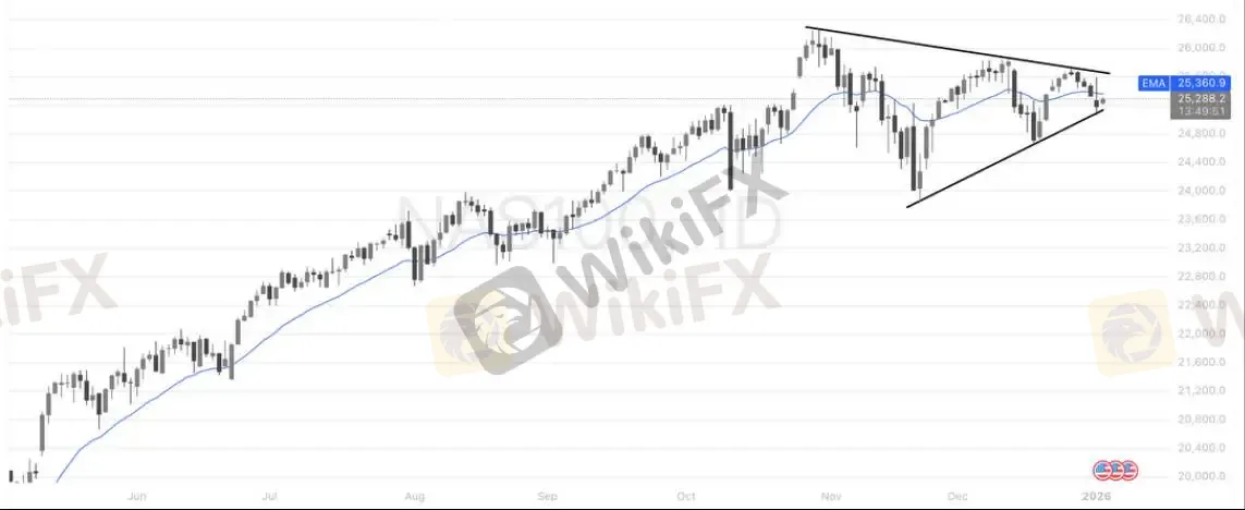 从当前日线结构看,纳指100的震荡下沿支撑主要来自两方面共振:一是收敛三角形下边趋势线,二是前期回踩形成的低点区域。该支撑大致位于25,000–25,100附近,一旦价格回落至该区间,往往伴随买盘介入,具备较强技术支撑意义。